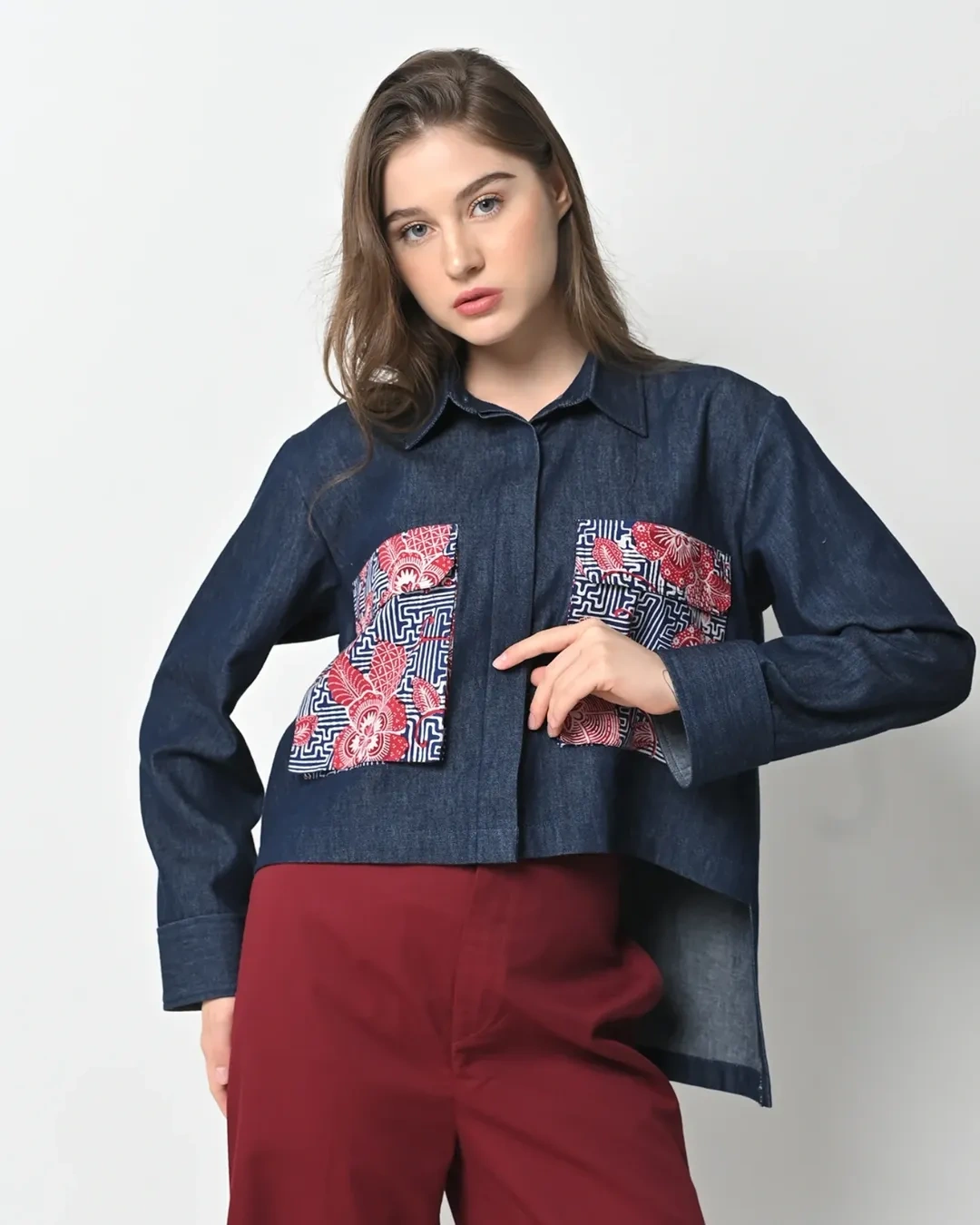 Denim dengan kombinasi batik cap motif bunga, cocok banget buat gaya santai kamu sehari-hari. Padukan denim klasik dengan sentuhan motif etnik modern — siap jadi pusat perhatian di setiap kesempatan!